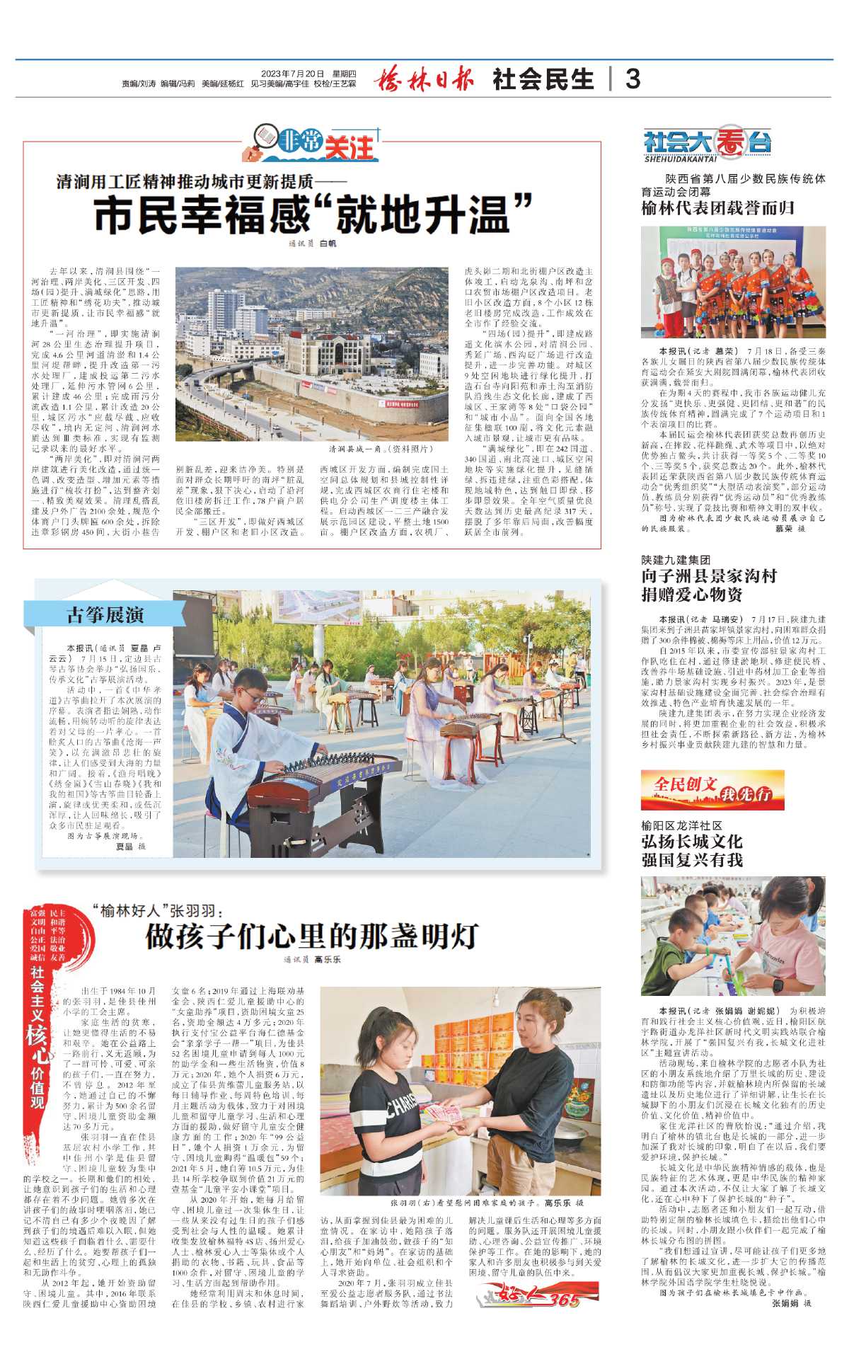 2020年7月,张羽羽成立佳县至爱公益志愿者服务队,通过书法舞蹈培训、户外野炊等活动,致力解决儿童课后生活和心理等多方面的问题。服务队还开展困境儿童援助、心理咨询、公益宣传推广、环境保护等工作。在她的影响下,她的家人和许多朋友也积极参与到关爱困境、留守儿童的队伍中来。