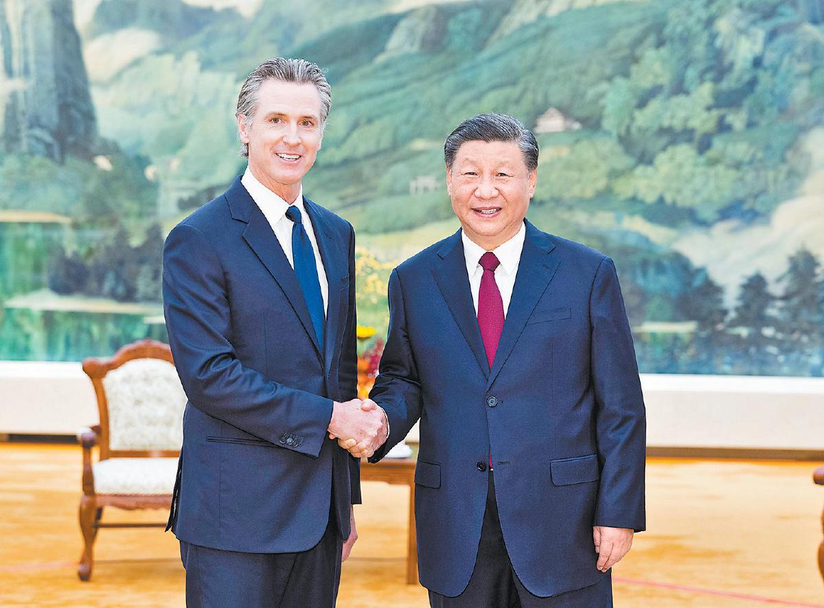 习近平愉快地忆及曾经访问加利福尼亚州的情形,介绍了中国绿色转型以及有关地方发展情况。习近平指出,发展好中美关系,需要汇聚各方力量。中美关系基础在民间,希望在人民,未来在青年,活力在地方。我高度重视并支持中美各界交往和地方合作。希望你此访增进双方相互了解,为扩大中国同加州合作、推动中美关系健康稳定发展发挥积极作用。中美在绿色发展、应对气候变化等领域合作潜力巨大,双方完全可以加强这方面合作,将其打造成中美关系发展新亮点。
