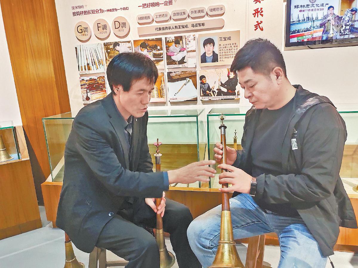 吴兴斌(左)在教授徒弟唢呐吹奏技艺。张丹 摄