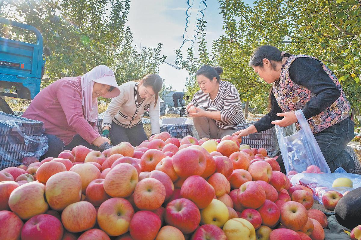 10月28日,靖边县东坑镇陆家山爱福果园家庭农场种植的苹果迎来丰收季,果农们忙着采摘、运输、分拣,处处皆是繁忙的景象。