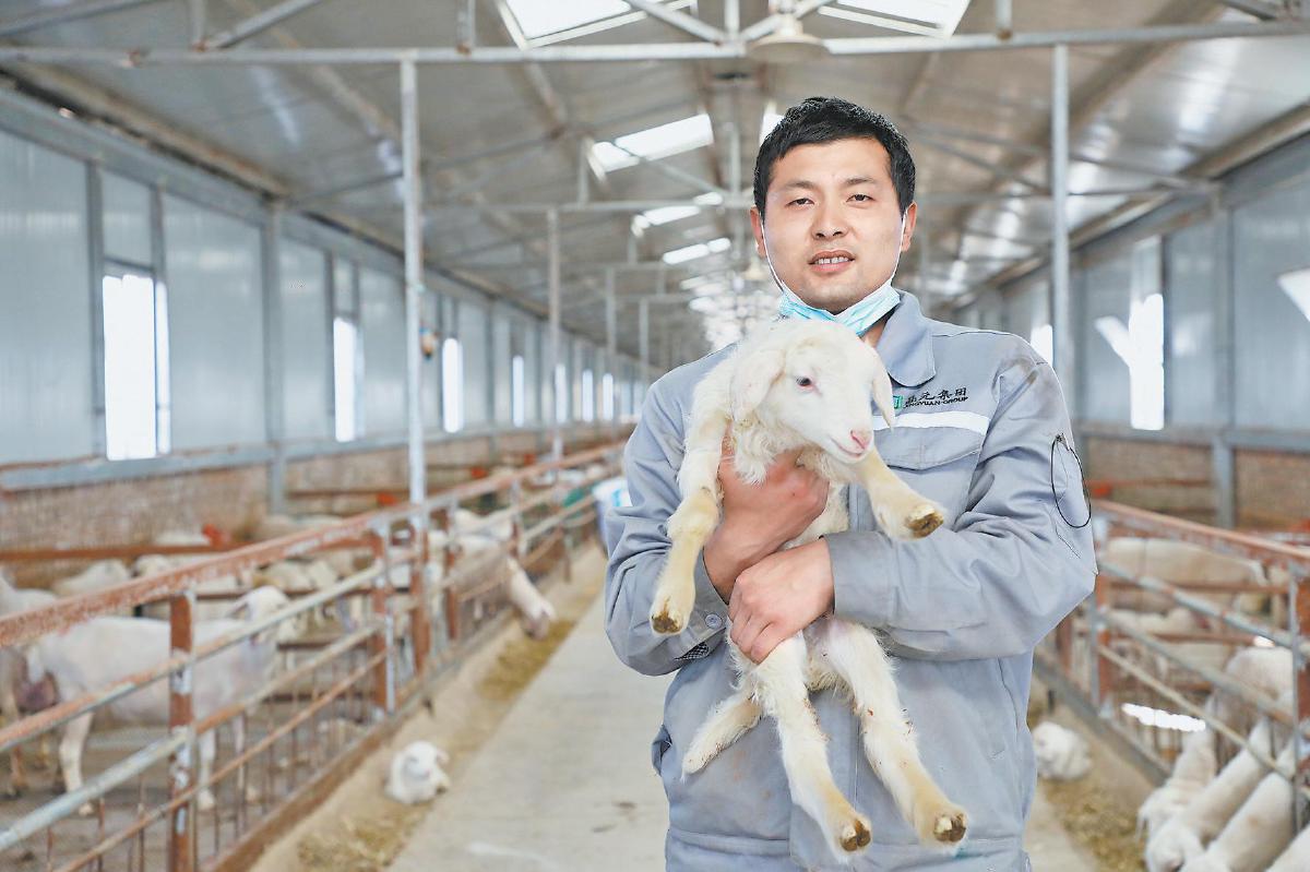 11月8日,万只湖羊养殖基地内,饲养人员开心地展示羊子。胡少鹏 摄