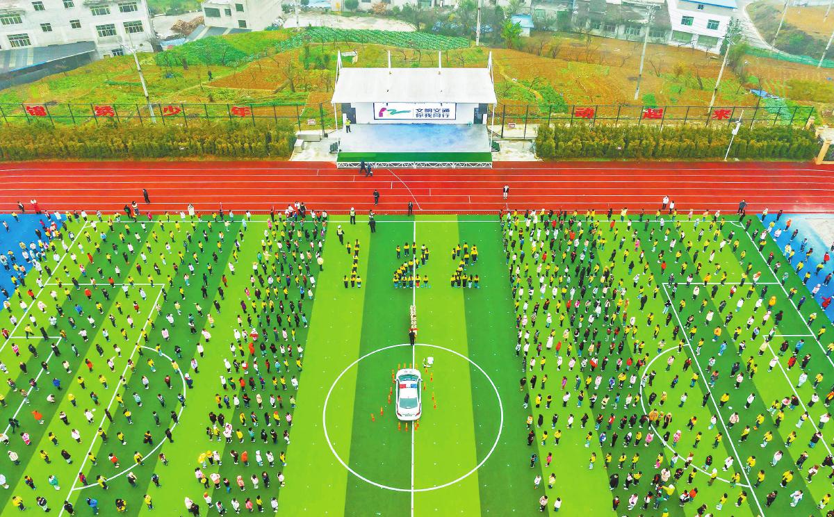 12月1日,交通民警在贵州省黔西市锦绣学校开展交通安全日主题宣传活动(无人机照片)。2023年12月2日是第十二个“全国交通安全日”,主题为“文明交通 你我同行”。