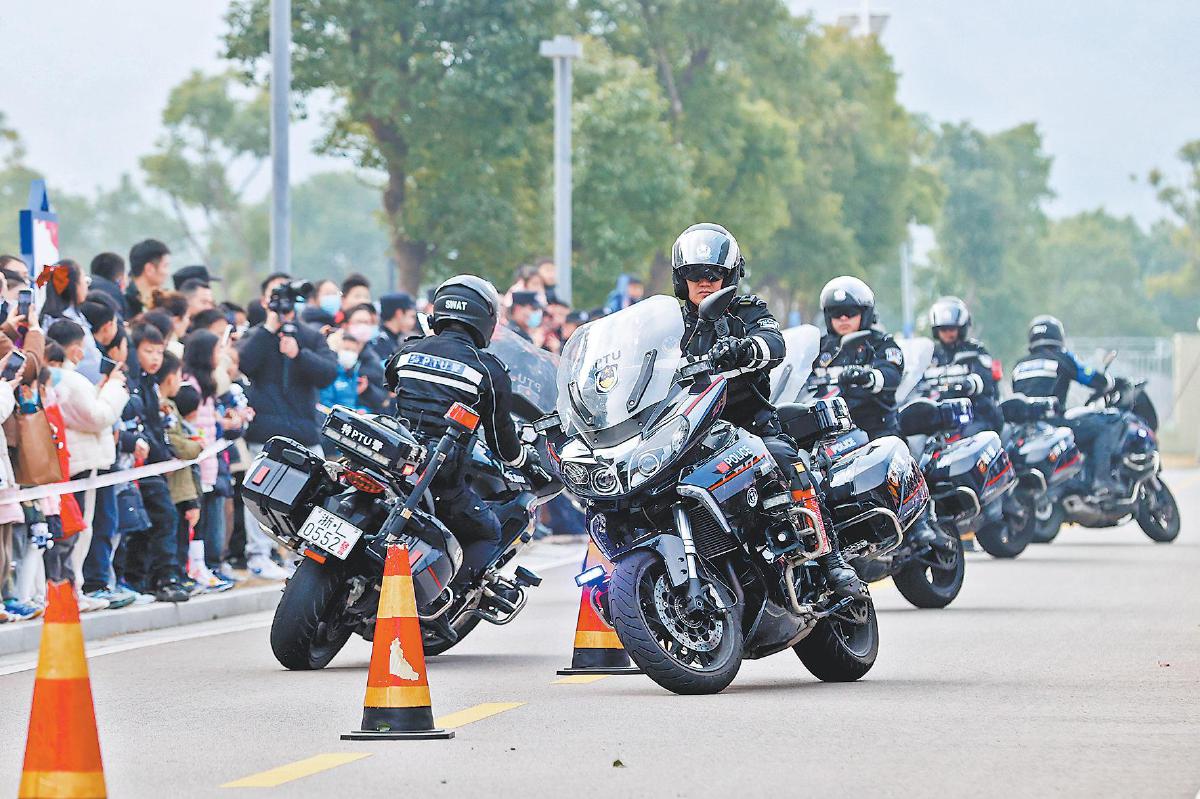 1月7日,市民在浙江省舟山市公安局举行的警营开放日活动现场观看警用摩托车表演。