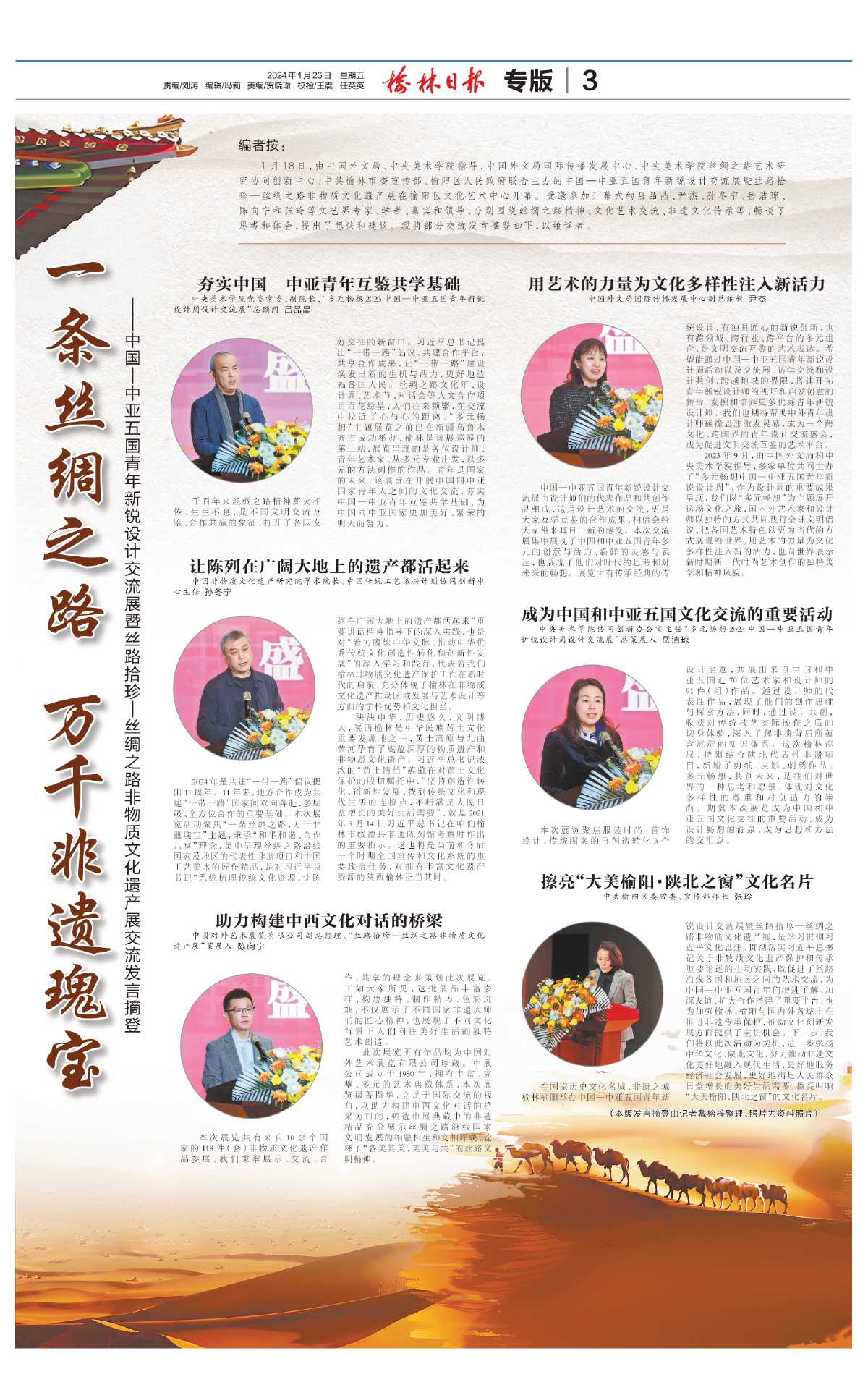 1月18日,由中国外文局、中央美术学院指导,中国外文局国际传播发展中心、中央美术学院丝绸之路艺术研究协同创新中心、中共榆林市委宣传部、榆阳区人民政府联合主办的中国—中亚五国青年新锐设计交流展暨丝路拾珍—丝绸之路非物质文化遗产展在榆阳区文化艺术中心开幕。受邀参加开幕式的吕品晶、尹杰、孙冬宁、岳洁琼、陈向宁和张玲等文艺界专家、学者、嘉宾和领导,分别围绕丝绸之路精神、文化艺术交流、非遗文化传承等,畅谈了思考和体会,提出了想法和建议。现将部分交流发言摘登如下,以飨读者。