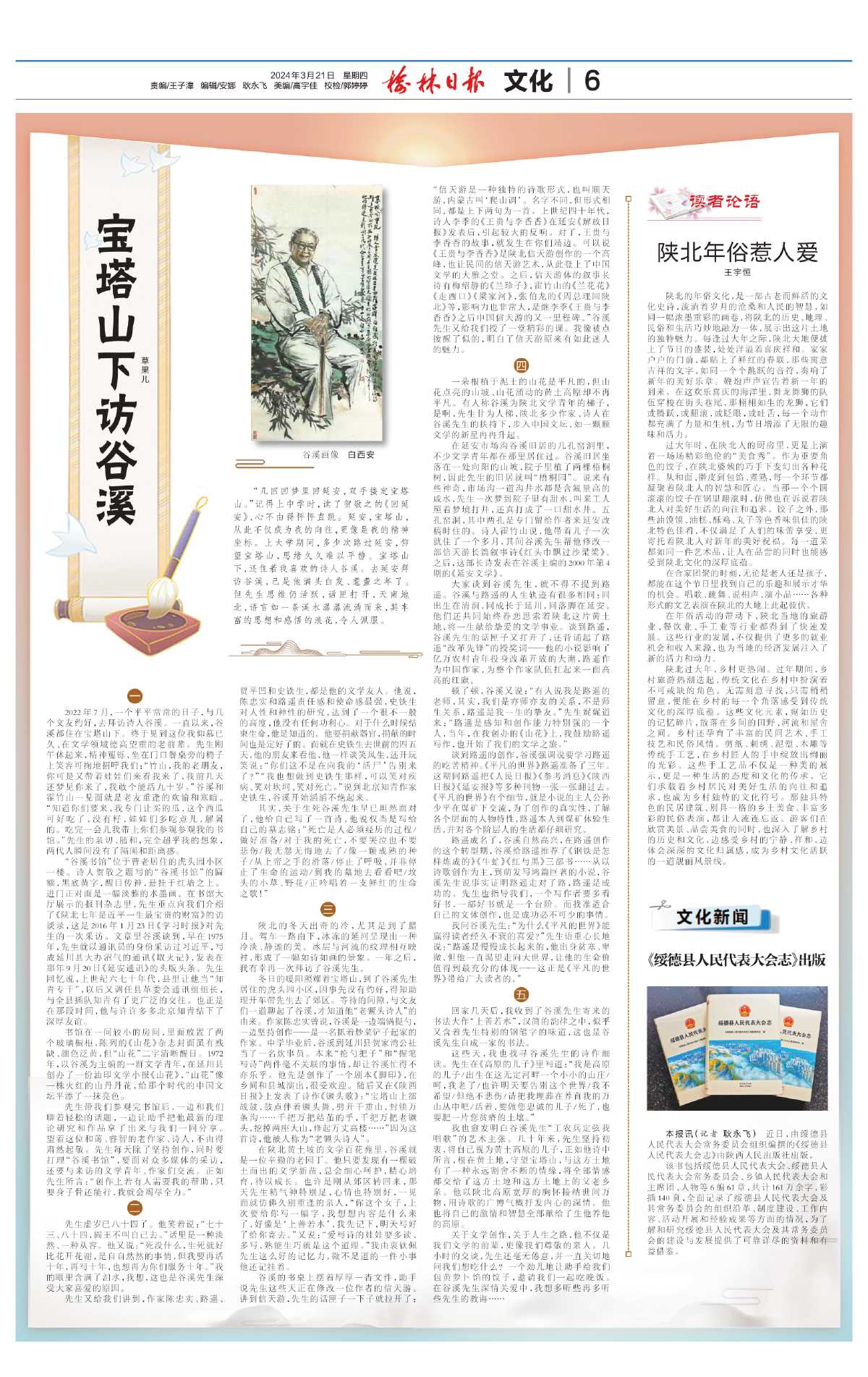 “几回回梦里回延安,双手搂定宝塔山。”记得上中学时,读了贺敬之的《回延安》,心不由得怦怦直跳。延安,宝塔山,从此不仅成为我的向往,更像是我的精神坐标。上大学期间,多少次路过延安,仰望宝塔山,思绪久久难以平静。宝塔山下,还住着我喜欢的诗人谷溪。去延安拜访谷溪,已是他满头白发、耄耋之年了。但先生思维仍活跃,话匣打开,天南地北,语言如一条溪水潺潺流淌而来,其丰富的思想和感悟的浪花,令人佩服。
