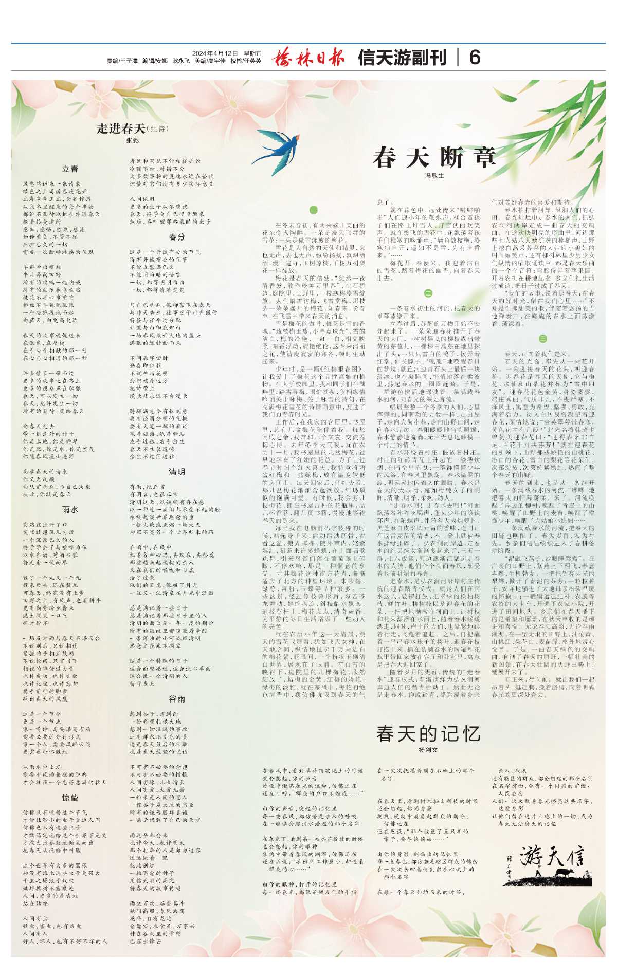 立春过后,苏醒的万物开始不安分起来了。一朵朵迎春花推开了春天的大门,一树树摇曳的柳枝露出嫩黄的芽苞儿,一棵棵白蒿芽在地里探出了头;一只只雪白的鸭子,拨弄着红掌,伸长脖子,“嘎嘎”地唤醒春日的梦境;就连河边青石头上最后一块薄冰,也在凝眸间,悄悄地落在柔波里,荡起春水的一圈圈涟漪。于是,一群游鱼快活地驾驶着一条满载春水的河,向春光的深处奔流。