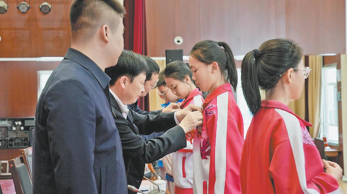 图为老师们为新入团学生佩戴团徽。