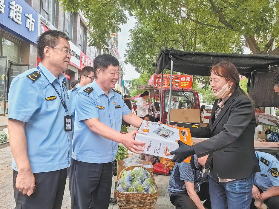 图为市市场监督管理局高新分局工作人员给摊贩免费发放电子秤。 张瑜 摄