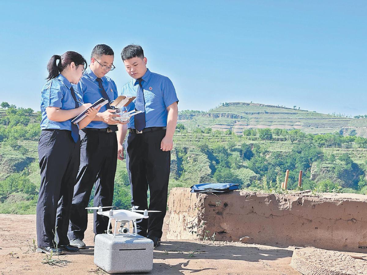 图为检察干警运用无人机勘探寨沟历史文化遗址保护情况。