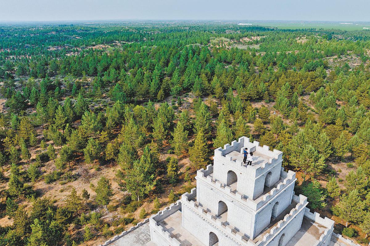 如今从这座“万里长城第一台”眺望,四周一片郁郁葱葱,6万亩樟子松等常绿树木组成的主要“方阵”,拱卫着镇北台,其间点缀、渲染着各种花草、灌木和其他树种。高台登临宛若绿海行舟,美景引来如织游客。