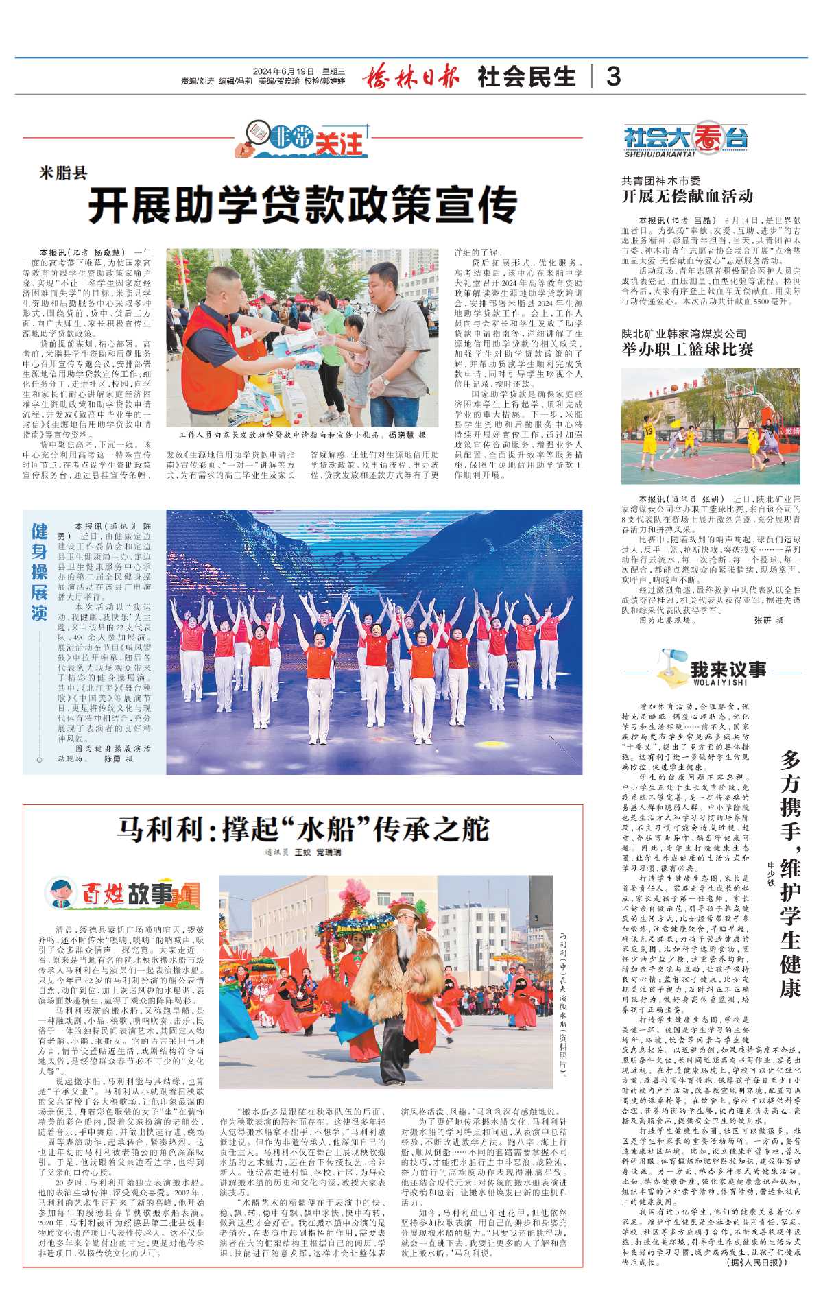 清晨,绥德县蒙恬广场唢呐喧天,锣鼓齐鸣,还不时传来“噢嗨、噢嗨”的呐喊声,吸引了众多群众循声一探究竟。大家走近一看,原来是当地有名的陕北秧歌搬水船市级传承人马利利在与演员们一起表演搬水船。只见今年已62岁的马利利扮演的艄公表情自然、动作到位,加上诙谐风趣的水船调,表演场面妙趣横生,赢得了观众的阵阵喝彩。