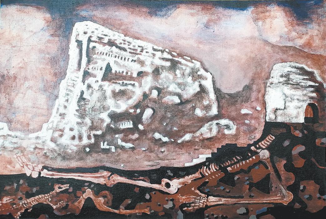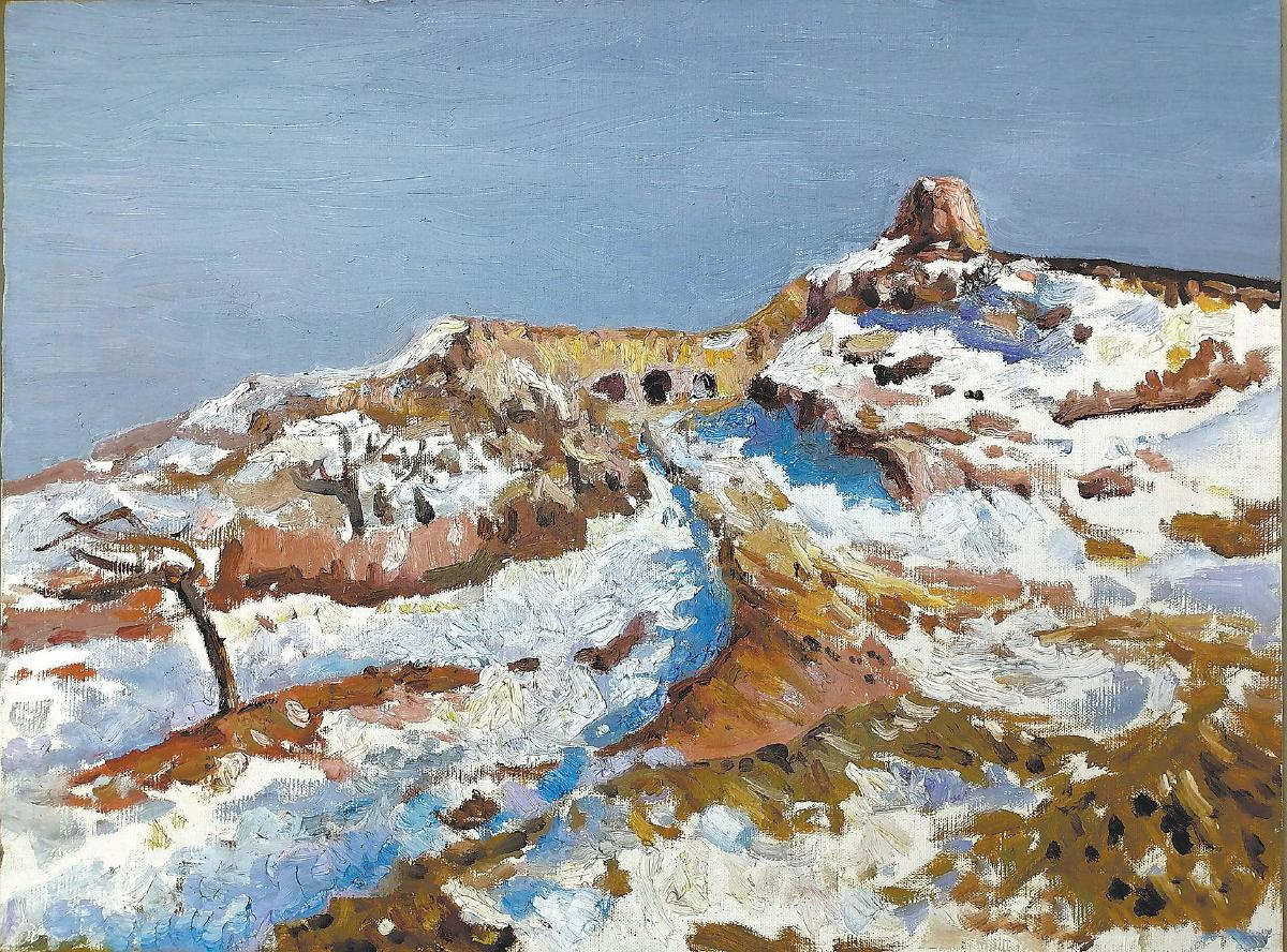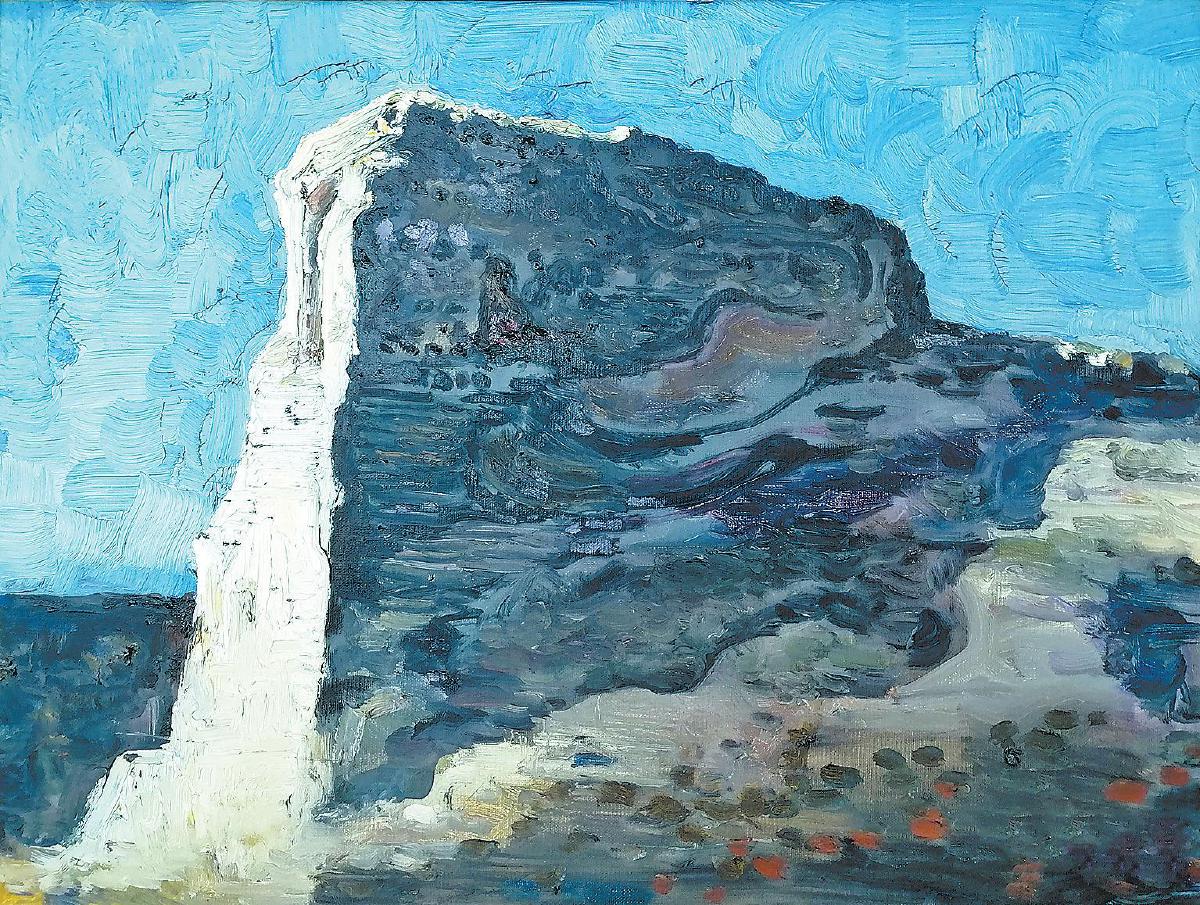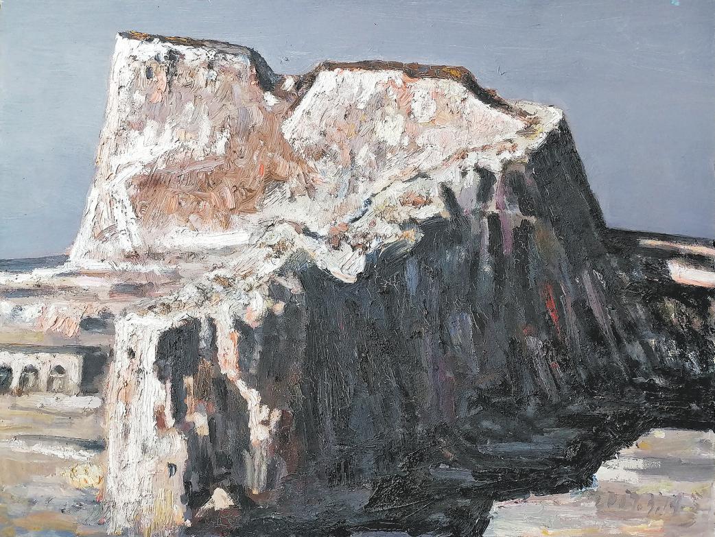 “墙”外“大白高国”祖先的印记遗留在画者的笔端,复读着对“墙”的刻骨铭心。远眺的“墙”,有写实日中时的雪景——《苏庄子》,笔法柔和;日落 时的雪景——《五里墩》,概括 了 雪痕中黄土地的硬朗;《镇北台》是秋草中城台的剪影。近观中的“墙”,岁月残留下的《长城》,像是在历史舞台下一束光产生的力量,“墙”的脊梁和“墙”内刚露头的青草。从光影写实中的《统万城》,到棕白两色抽离下象征战争的幻影——《白城子》,《老城》的古朴高贵,《断城》的庄严冷漠,无不透出“墙”给画者血脉中的记忆。