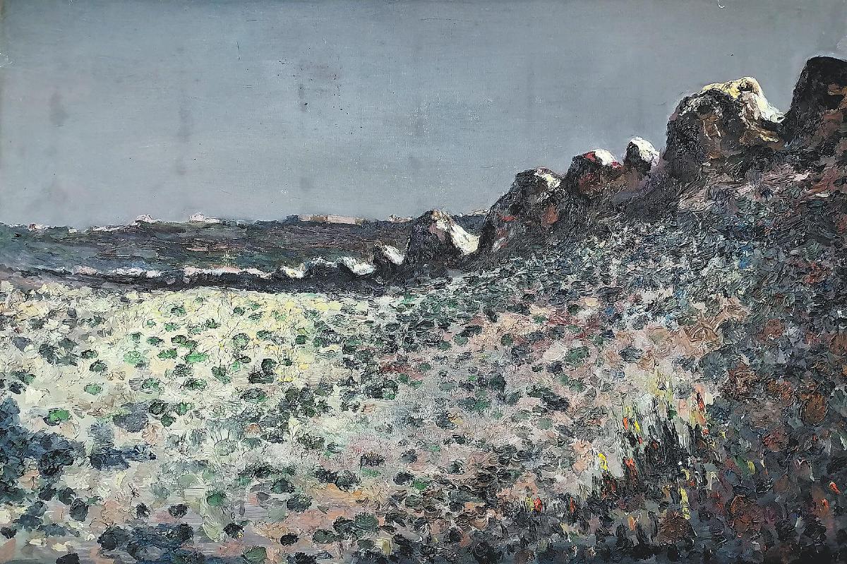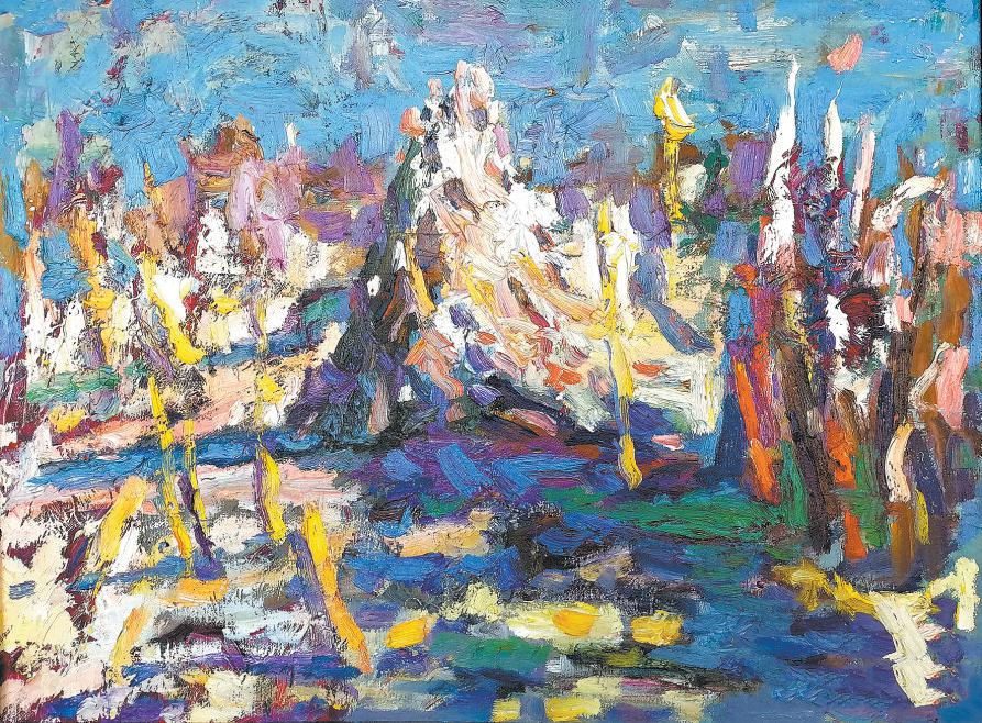 组成这些“墙”里浪漫的气息,还有雪和劳作的人们。眼前《雪地里》伸向天空黑棕色的树干撑着陕北人生活的空间,视野可以延伸到“墙”下的土窑、远处的山,白雪、枝杈、窑顶、远山都泛着金色的浪漫;下了雪的《天鹅海子》,天高地阔,一棵树就是一个人家的标识,一院土窑像露出大地的胸膛召唤着来客。光晕中的《杨家城遗址》有一位幸福的耕作者,是画者想象中年轻的母亲;《春耕》是画者经常看到的种土豆的人,画者老把自己比作米勒,他俩都认为劳动者是最美的人。《玉米地》是冬日下的玉米秆垛子,弥漫着暮冬的闲散;而初秋的《玉米秆子》折射着丰收的炫彩。当夏天的晨曦穿过《横山写生群》,迷蒙幻彩中呈现着姿态各异的画者,被写生的《青崖窑》也被浸泡在晨雾中熠熠生辉,仿佛是在天边。
