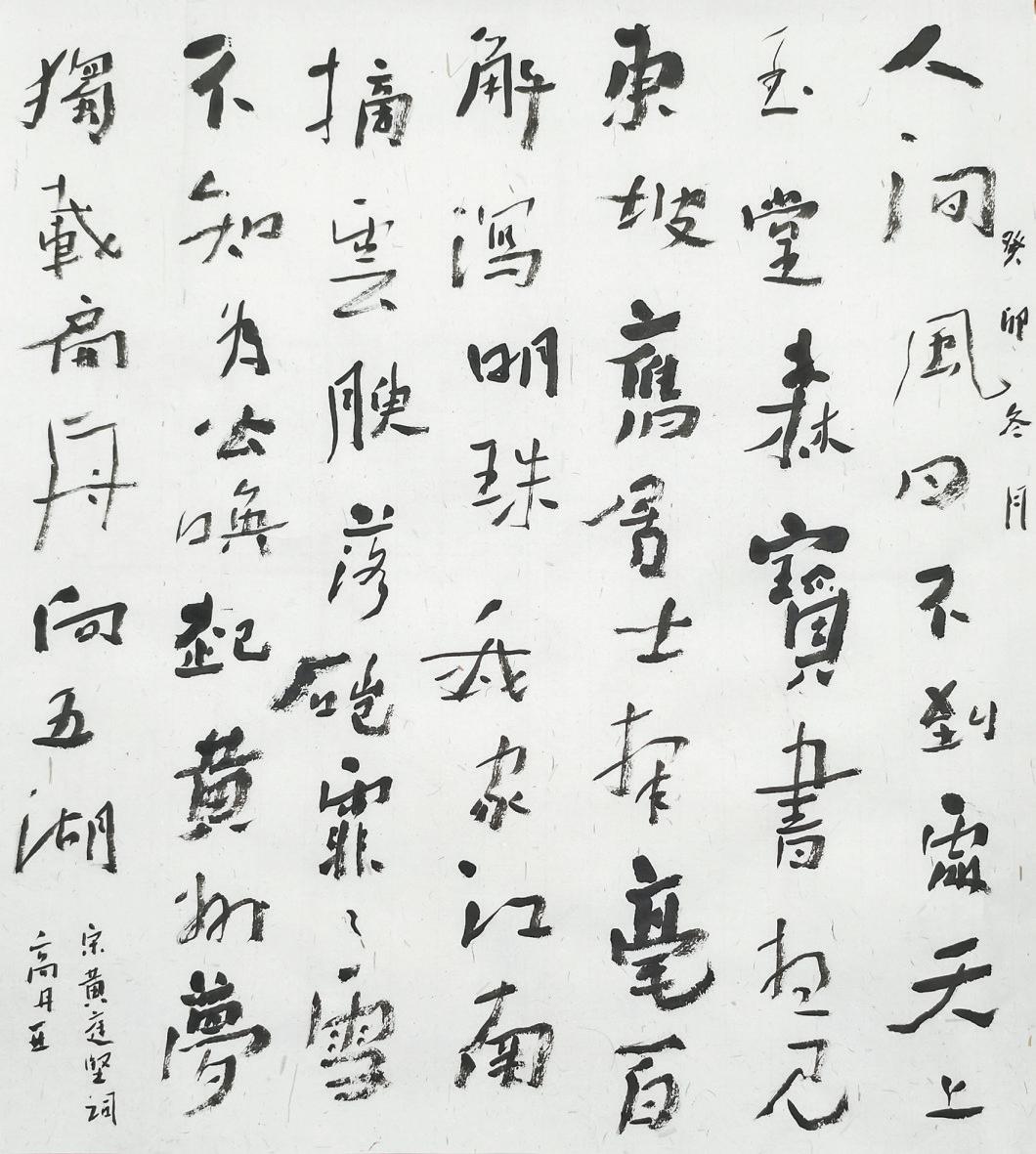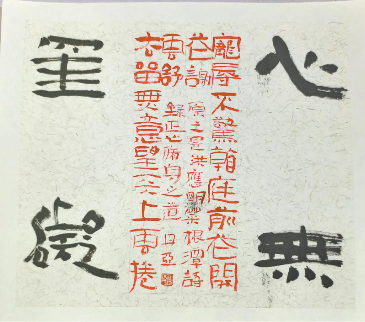探索,是说一个书写人随着年轮的增加与手上书写功夫的不断提升,自然而然会有一种比常人过于敏感的内心,内心会积累无穷的人生感受,有时无意中的记忆远远多于有意的记忆。深藏在心中的积累远大于纸上的有限墨迹。这些记忆无形地拥满心中,日积月累不知道会在某一天出现意外形态的墨痕,勾勒出某时的心迹,一旦捕捉到偶然,就会反复实践,再加强、深化,恨不得把瞬间化为永恒。然而在多个这样的瞬间过后,再回头审视自己,审视曾在案上的墨迹,不由会问:除了写好字,这宣纸上还能有什么更好的表达?想到释迦牟尼讲了一生法后,还是一句:说法者无法可说,是名说法。写了多少字,费了多少纸,目前我也只得出了一个“意”字。“意”指什么?是笔意,简单了;是墨色,又技术化了;是章法,形式有余内涵不足。古人有意在笔先,然后下字。书法又称书道,道里有意,意是从合乎天道的一切心内宇宙产生的框架结构,在线条的处理上,它是感性与理性相结合的形态,单用逻辑归纳或几何分析都属于舍本逐末,一切心外求法终不得究竟。写字达到艺术层面,它就是写心,而心是既清晰又模糊,不可量化,有时它很近,有时却很远,笔与墨夹在中间随着心的流动,也易也难,让人不断琢磨而显得深邃,为伊消得人憔悴。