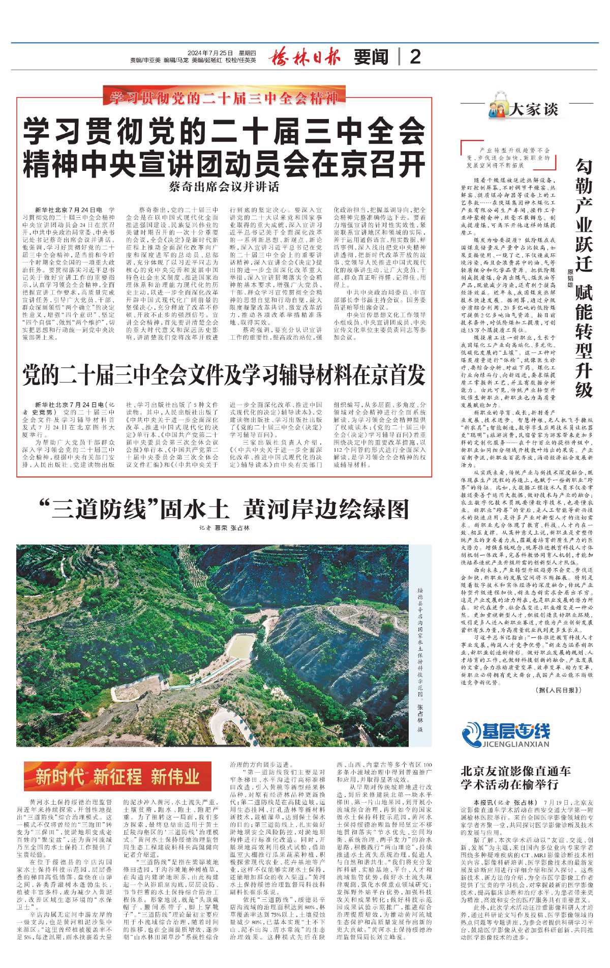 “三道防线”是指在梁峁坡地修田造园,于沟谷坡地种树植草,在沟道内建淤地坝系,由此构建起一个从峁顶至沟底,层层设防、节节拦蓄的水土保持综合防治工程体系。形象地说,就是“头顶戴帽子、腰间系带子、脚上穿靴子”。“三道防线”理论最初主要应用于小流域综合治理,随着时间的推移,也在全面提质增效,逐步朝“山水林田湖草沙”系统性综合治理的方向阔步迈进。