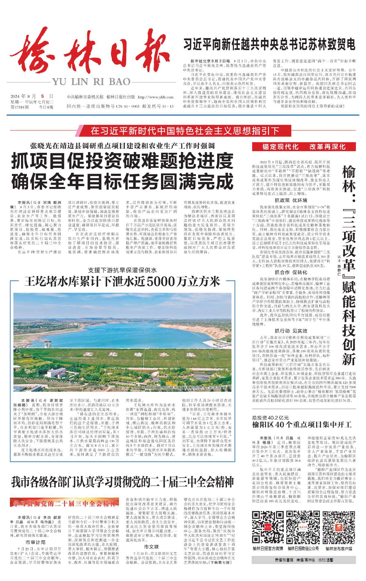 王圪堵水库作为全市水资源“东西连通、南北互济、统一调度”调配枢纽“中转站”,向东,为榆横工业区、科创新城、横山新区、榆林高新区和中心城区供水;向南,供水给绥德、米脂、子洲县城和沿线10个乡镇;向西,则为横山、靖边城区和靖边能化园区及沿线5个乡镇供水。面对7月以来的旱情,王圪堵水库从防汛模式“一键切换”为抗旱模式,组织工作人员24小时巡查巡防,科学滚动调度水资源,实现水资源的合理利用。