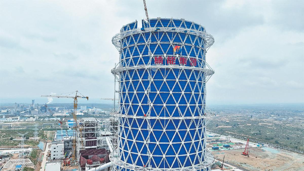 图为榆神榆横2×350兆瓦热电联产工程间冷塔顺利到顶现场。 孙永波 摄