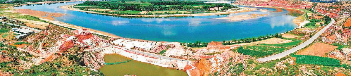 冲上河西岸一段起伏的山路,我们首先抵达“黄河入陕第一湾”观景台。站在高台北望,黄河从蒙晋大地浩荡着奔流而来,在墙头形成一个巨大的“S”形弯,河西秦地,耸立的丹霞崖石之上“黄河龙湾”摩崖极为醒目。俯瞰脚下,黄河在此犹如一张巨大的太极图,阳极是水草丰美、绿树成荫的塞上江南,阴极是丹霞秃岭、墩台高耸的大漠孤烟,让人不禁想起唐代诗人王维笔下“大漠孤烟直,长河落日圆”的壮阔景象。