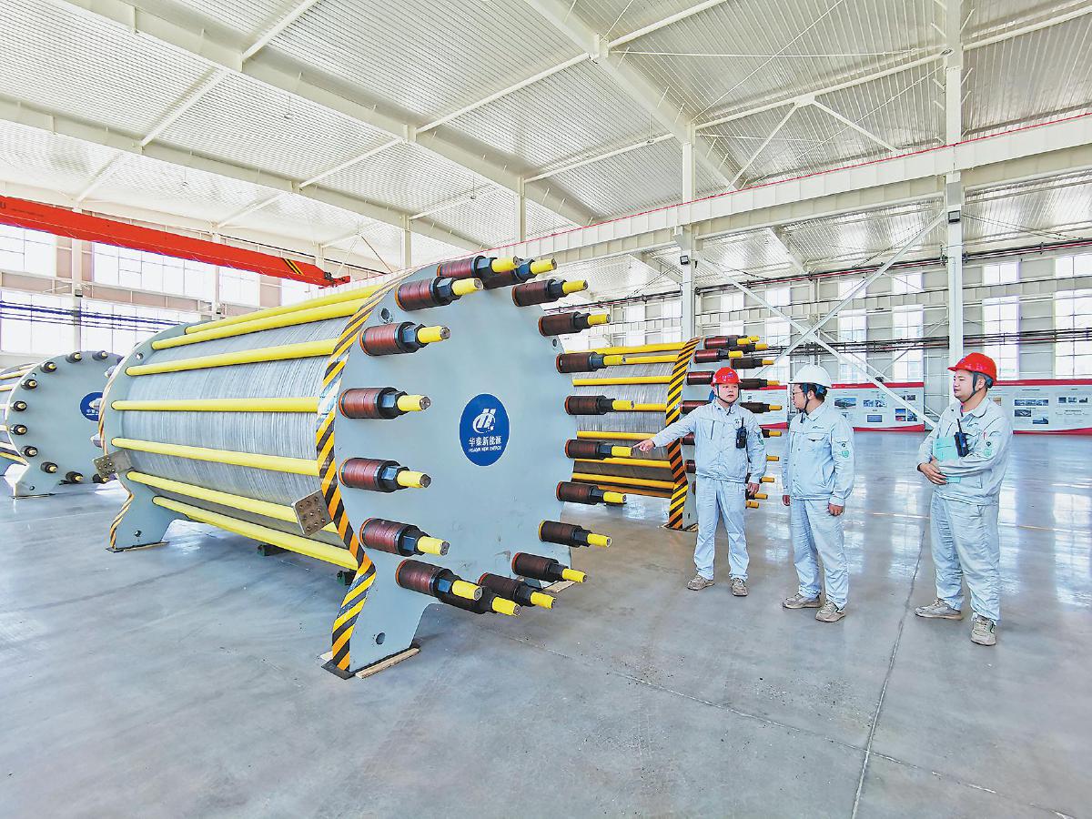 华秦新能源工作人员在对高活性电极电解槽产品进行检查(八月二十八日摄)。 郝彦丰 摄