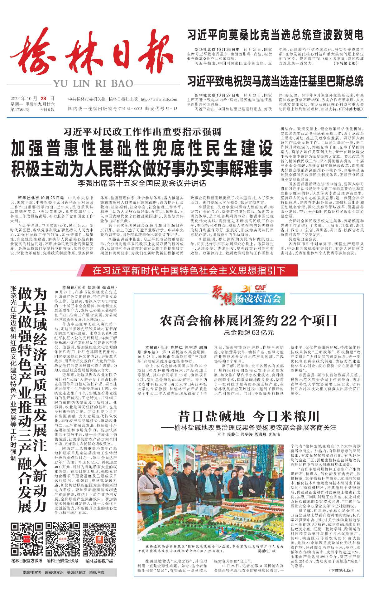 “我们将锚定‘打造全省粮食产能提升示范区’目标,努力把现有科技成果提升转化为新质生产力,以更科学的手段、更精准的举措向150万亩盐碱地‘要粮’,为西北地区盐碱地改良治理提供‘榆林方案’。”刘健鹏说。