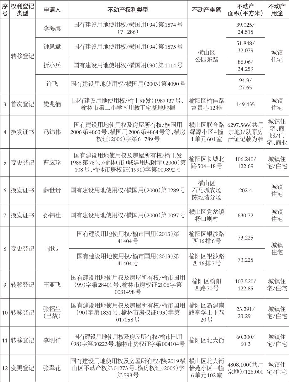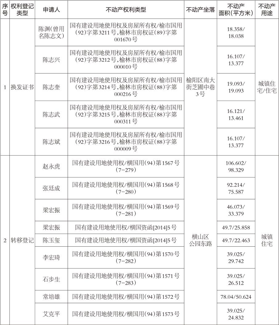 经初步审核,我中心拟对下列不动产权利办理转移登记、首次登记、变更登记、换发证书不动产登记事项登记业务。根据《不动产登记暂行条例实施细则》第十七条的规定,现予以公告。如有异议,请自本公告之日起15个工作日内将异议书面材料送达我中心。逾期无人提出异议或者异议不成立的,我中心将予以登记。