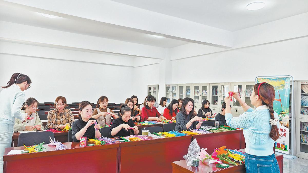 在麟州街道宏光社区手工制作公益课堂上,手工老师指导学员们制作扭扭棒花束。宋艳霞 摄