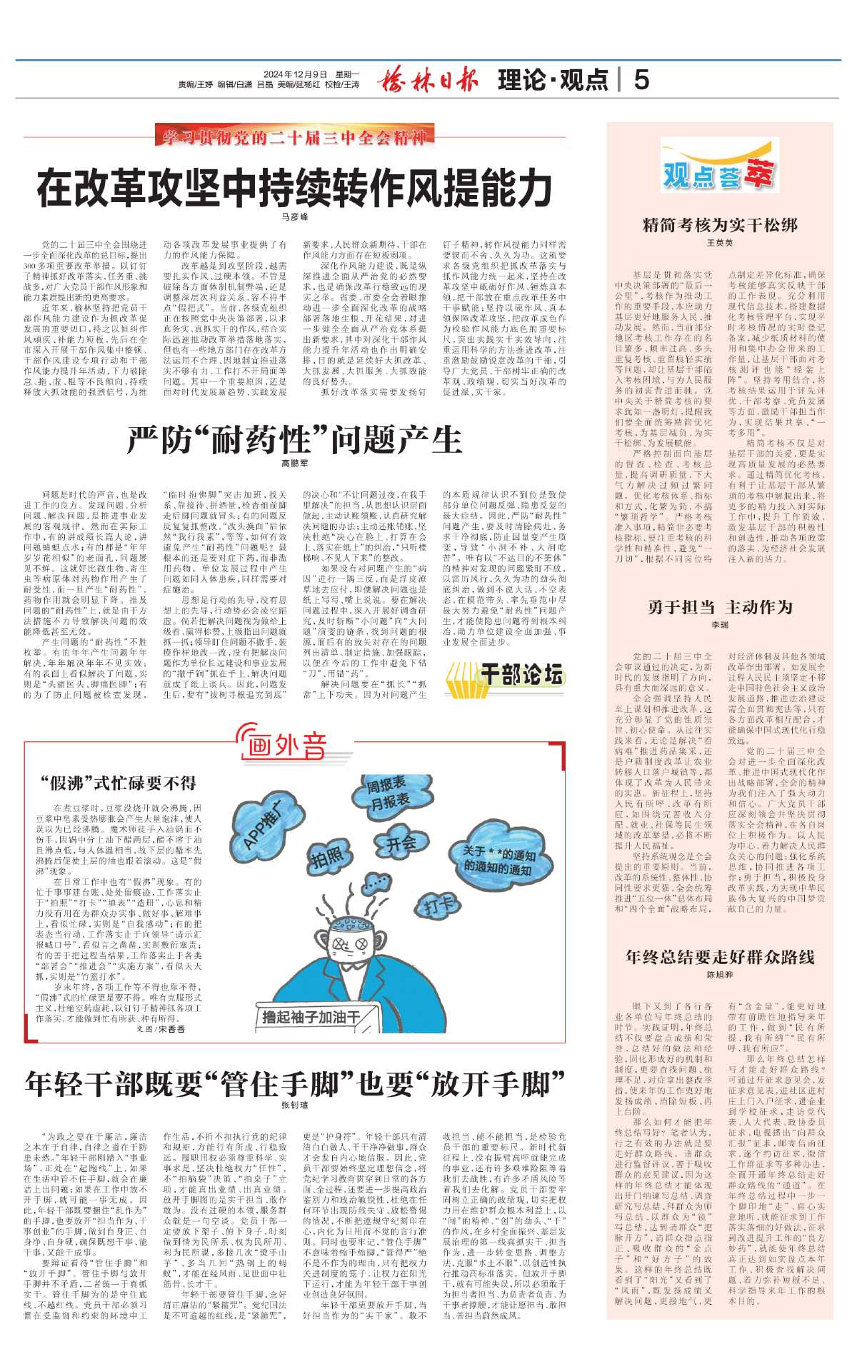 在日常工作中也有“假沸”现象。有的忙于事事建台账、处处留痕迹,工作落实止于“拍照”“打卡”“填表”“造册”,心思和精力没有用在为群众办实事、做好事、解难事上,看似忙碌,实则是“自我感动”;有的把表态当行动,工作落实止于向领导“请示汇报喊口号”,看似言之凿凿,实则敷衍塞责;有的善于把过程当结果,工作落实止于各类“部署会”“推进会”“实施方案”,看似天天抓,实则是“竹篮打水”。