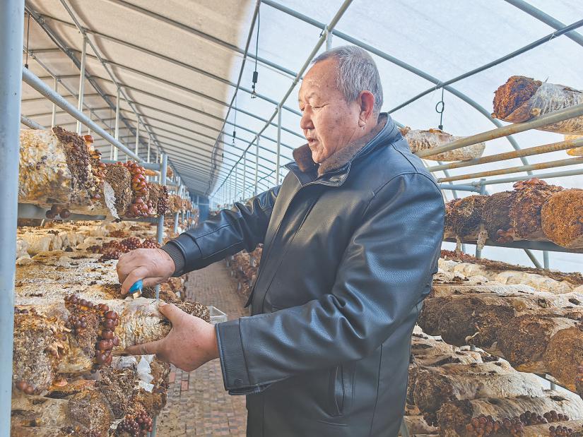 在菌菇大棚内,一架架菌棒整齐排列,一丛丛滑子菇簇拥而生,村民忙着采摘成熟的滑子菇。“我们家承包了16个大棚,这几天气温逐步降低,要抓紧采摘。”菇农张保国说,滑子菇生长期较短,平均一个月可以采收一茬,一个菌棒可以产出七茬菇4斤左右,一个大棚的收益能达到2万元,利润非常可观。