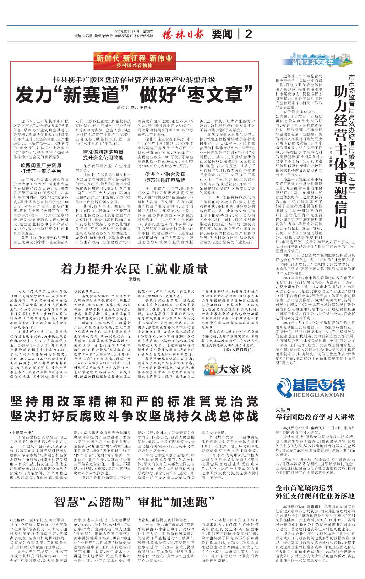 下一步,佳县将持续深化与广陵区的跨区域协作,聚力打造流程更优、审批更快、服务更好的营商环境,进一步加大对红枣加工企业的扶持力度,吸引更多相关企业入驻。同时,以科技创新带动高附加值产品研发,加快实现红枣、旅游、电商等产业多元融合,凝心聚力推动红枣产业转型升级,为乡村全面振兴、群众增收致富奠定更加坚实的产业基础。