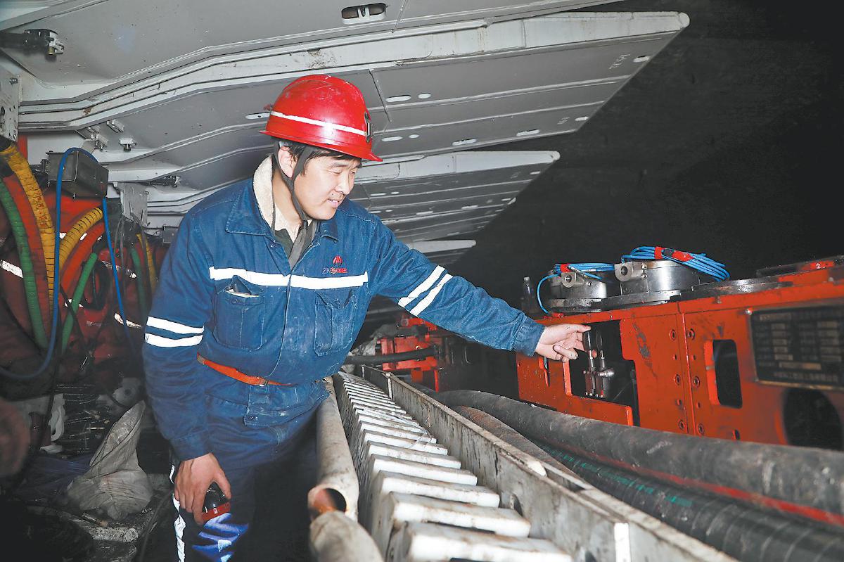 袁大滩煤矿职工在400米超长工作面检查设备运行情况。通讯员 刘强 摄