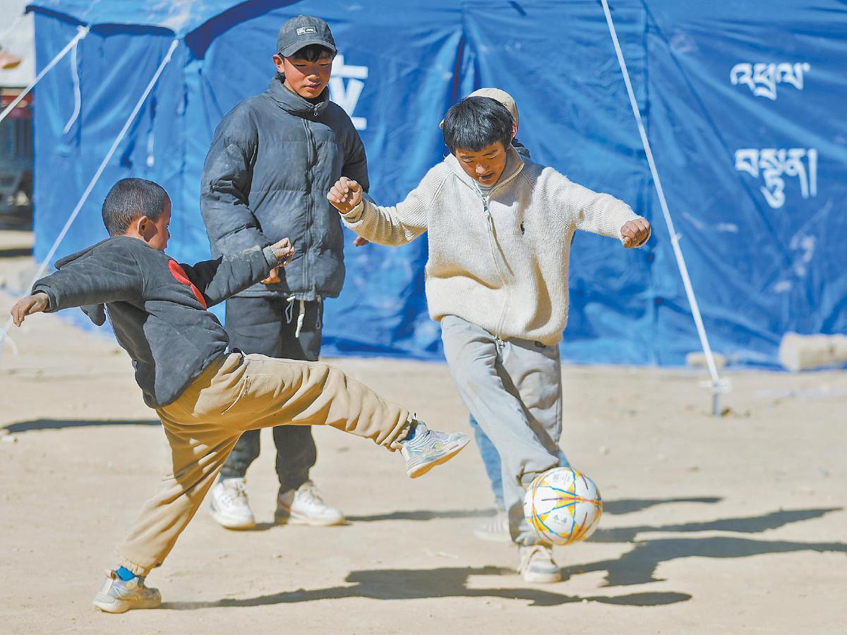 1月11日,在定日县曲洛乡措昂村,孩子们在临时安置帐篷间的空地上踢足球。