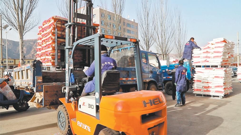 图为工作人员在卸载爱心物资。 姬婧 摄