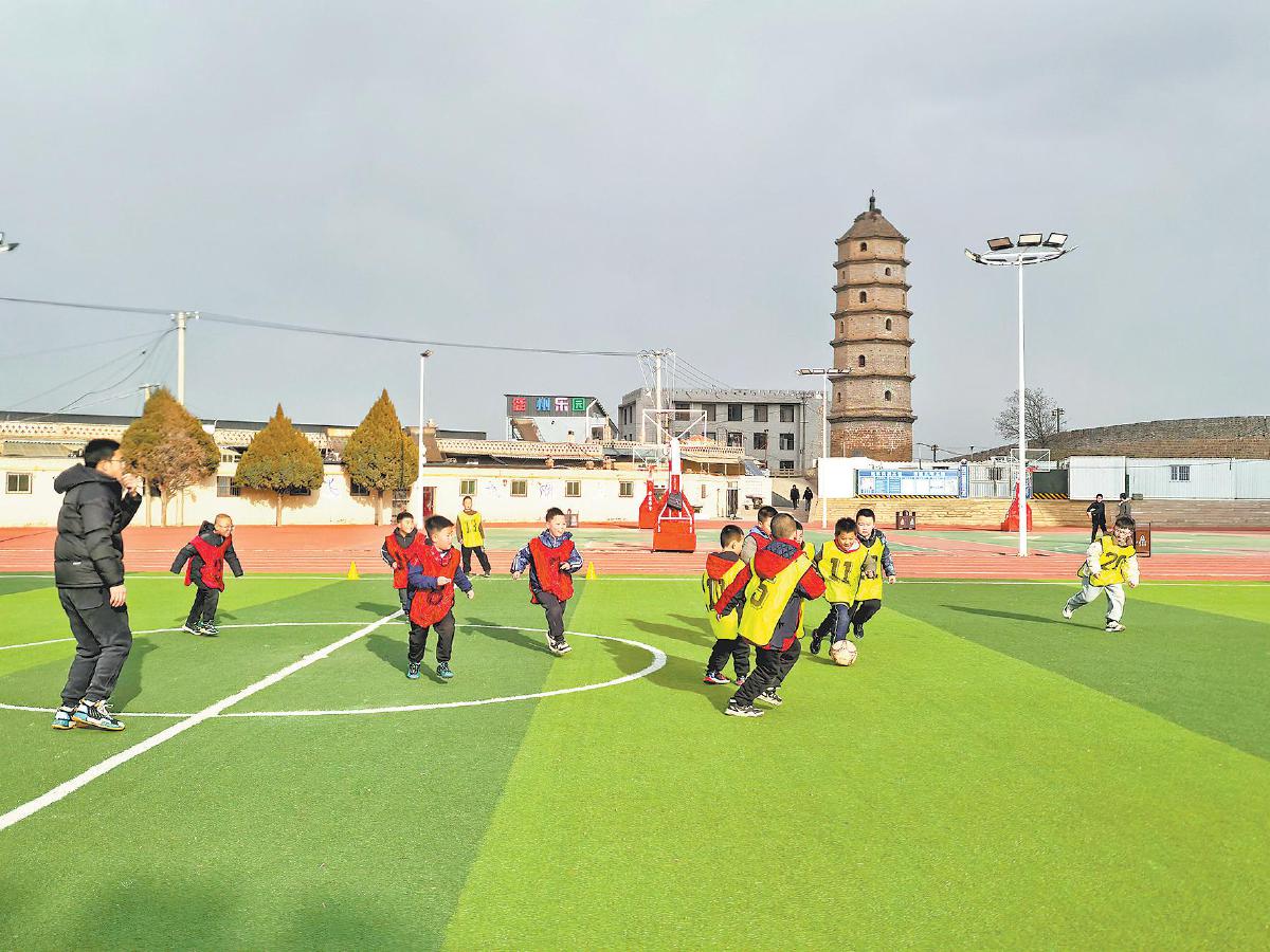 抢断、传球、射门……足球场上,在体育老师的指挥下,小球员们来回奔跑,刻苦练习,不仅锻炼了身体,而且磨炼了意志,尽情享受足球运动带来的快乐。