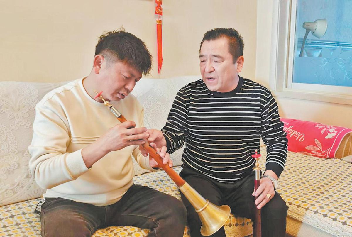 王保国(右)向徒弟传授唢呐技艺。张丹 摄