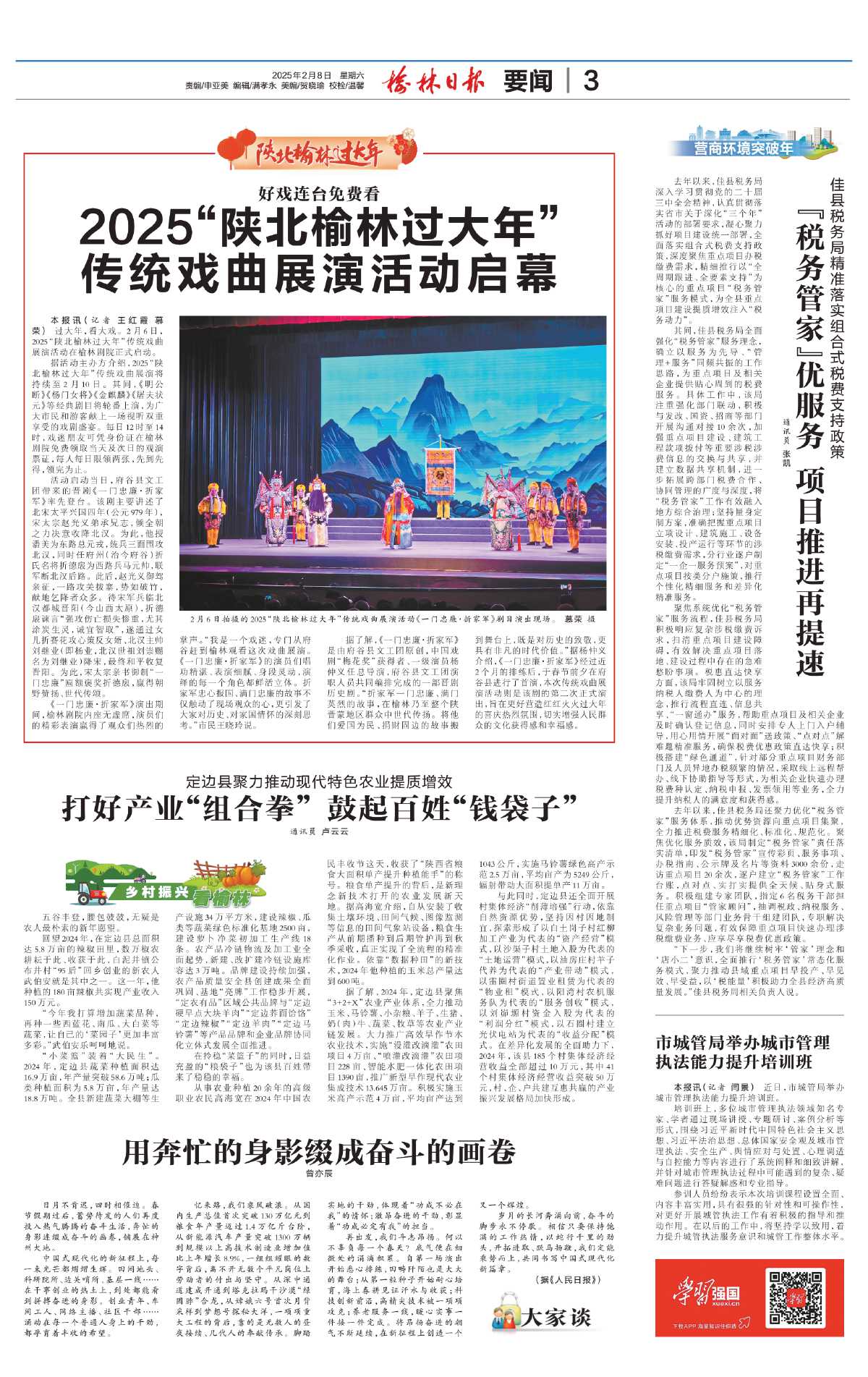 与此同时,定边县还全面开展村集体经济“削薄培强”行动,依靠自然资源优势,坚持因村因地制宜,探索形成了以白土岗子村红柳加工产业为代表的“资产经营”模式,以沙渠子村土地入股为代表的“土地运营”模式,以油房庄村羊子代养为代表的“产业带动”模式,以雷圈村街道置业租赁为代表的“物业租”模式,以阳湾村农机服务队为代表的“服务创收”模式,以刘峁塬村资金入股为代表的“利润分红”模式,以石圈村建立光伏电站为代表的“收益分配”模式。在差异化发展的全面助力下,2024年,该县185个村集体经济经营收益全部超过10万元,其中41个村集体经济经营收益突破50万元,村、企、户共建互惠共赢的产业振兴发展格局加快形成。