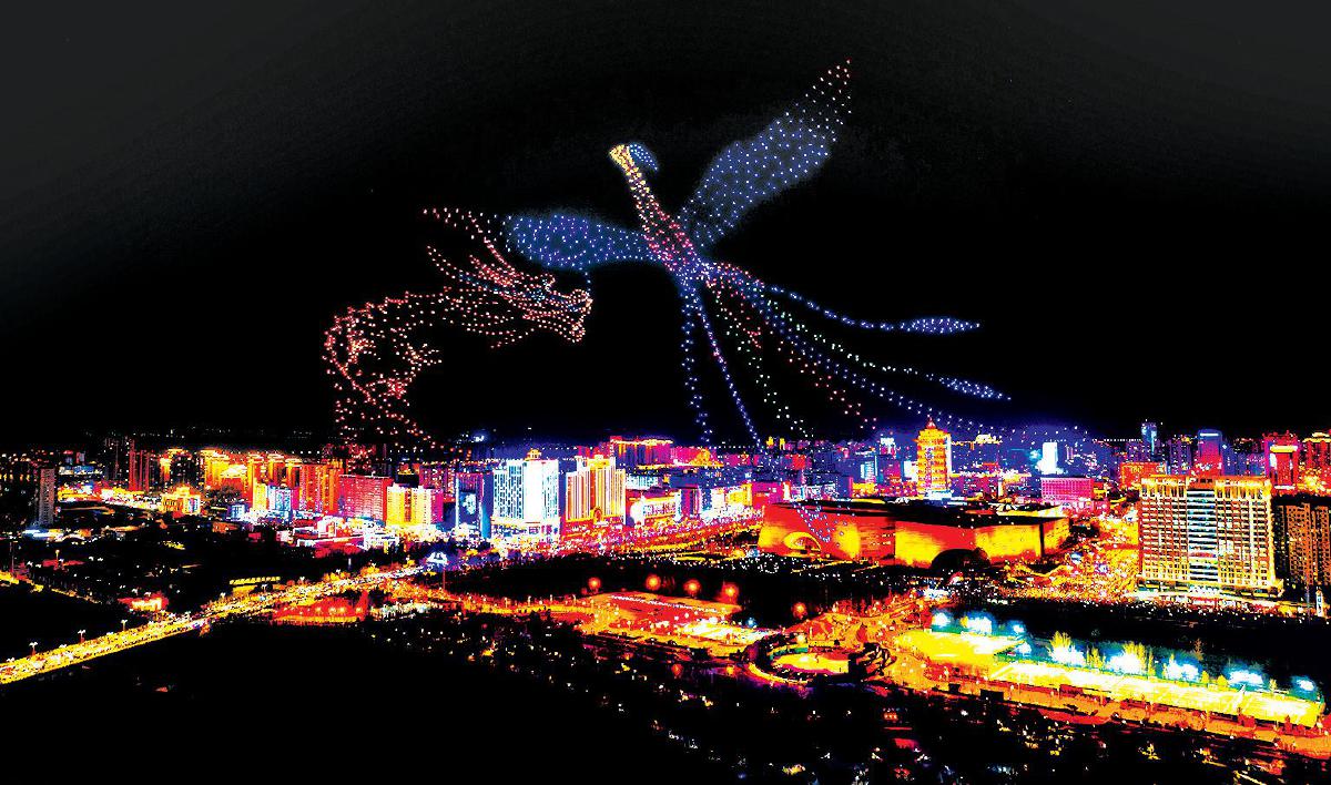 当日20时,榆林古城东城墙场地内,随着音乐响起,2000架无人机亮灯矩阵起飞。随后,“非遗贺新春 古城过大年”标语、腰鼓舞韵、榆林古城风貌、镇北台雄姿、“走进塞上明珠 感受多娇驼城 大美榆林欢迎您”标语等10幅精美飞行图案依次呈现。最后,无人机群幻化为满天流星缓缓降落地面,画面璀璨唯美。