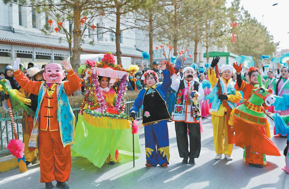 上午,过街秧歌展演队伍从采油厂演出点蜿蜒至鼓楼演出点,大秧歌、跑旱船、三弦说唱等节目轮番登场。