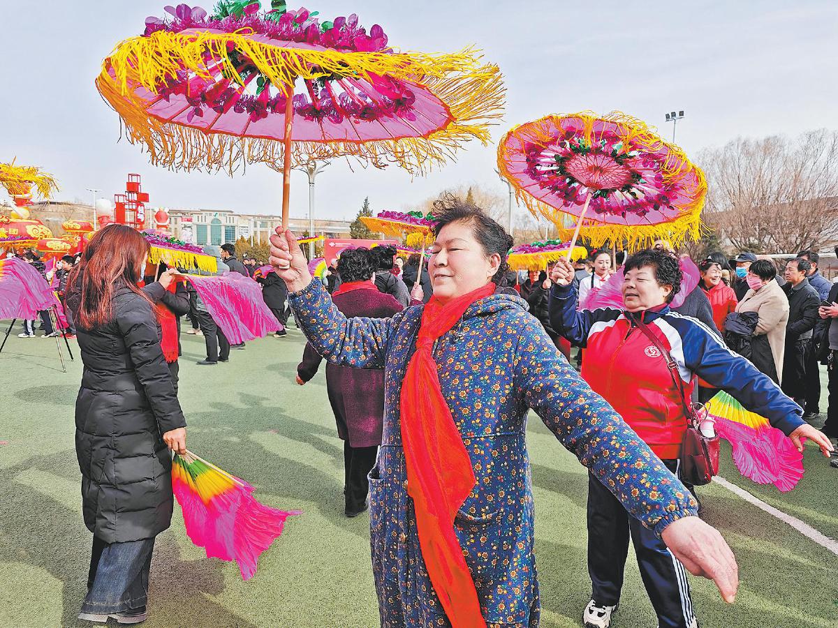 在榆林世纪广场“非遗国潮荟”区域,外地游客们或持花伞,或舞彩扇,现场展示起刚学会的十字步、摆手等陕北秧歌技法。