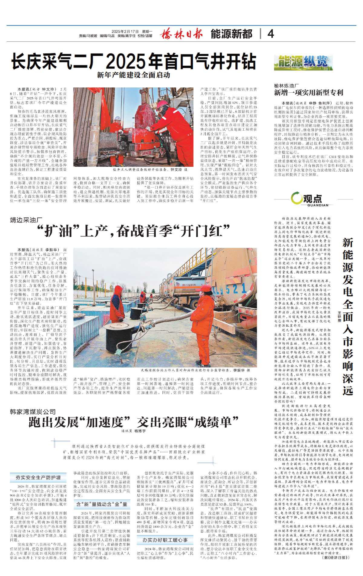 目前,全厂生产运行安全平稳,产量同比增加12%,项目参建人员全部到岗到位,就位钻机55部,2部钻机已开钻,8部钻机正在开展现场标准化作业,钻井工程高效有序组织启动。改扩建、技改工程及其他各项重点项目建设正加快启动步伐,试气及地面工程将在2月底全面开工。
