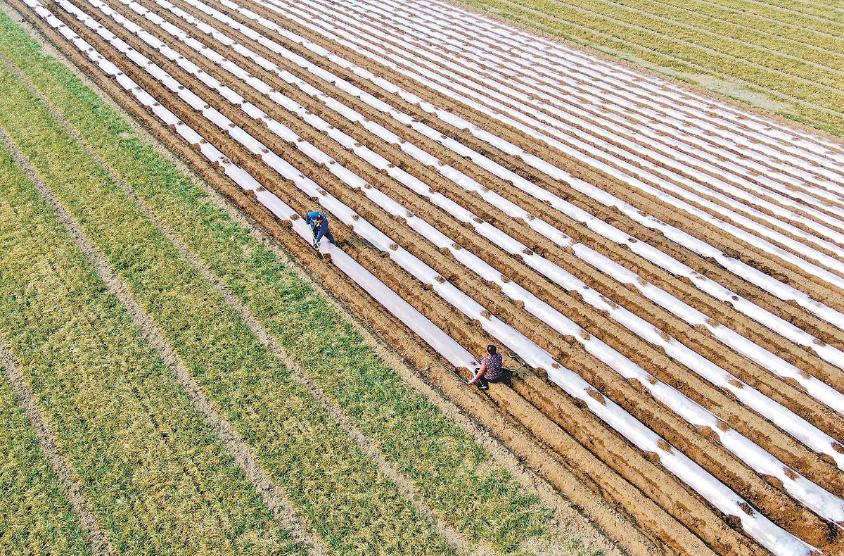 2月21日,山东省临沂市平邑县平邑街道农民在田间为种植的马铃薯覆盖地膜(无人机照片)。