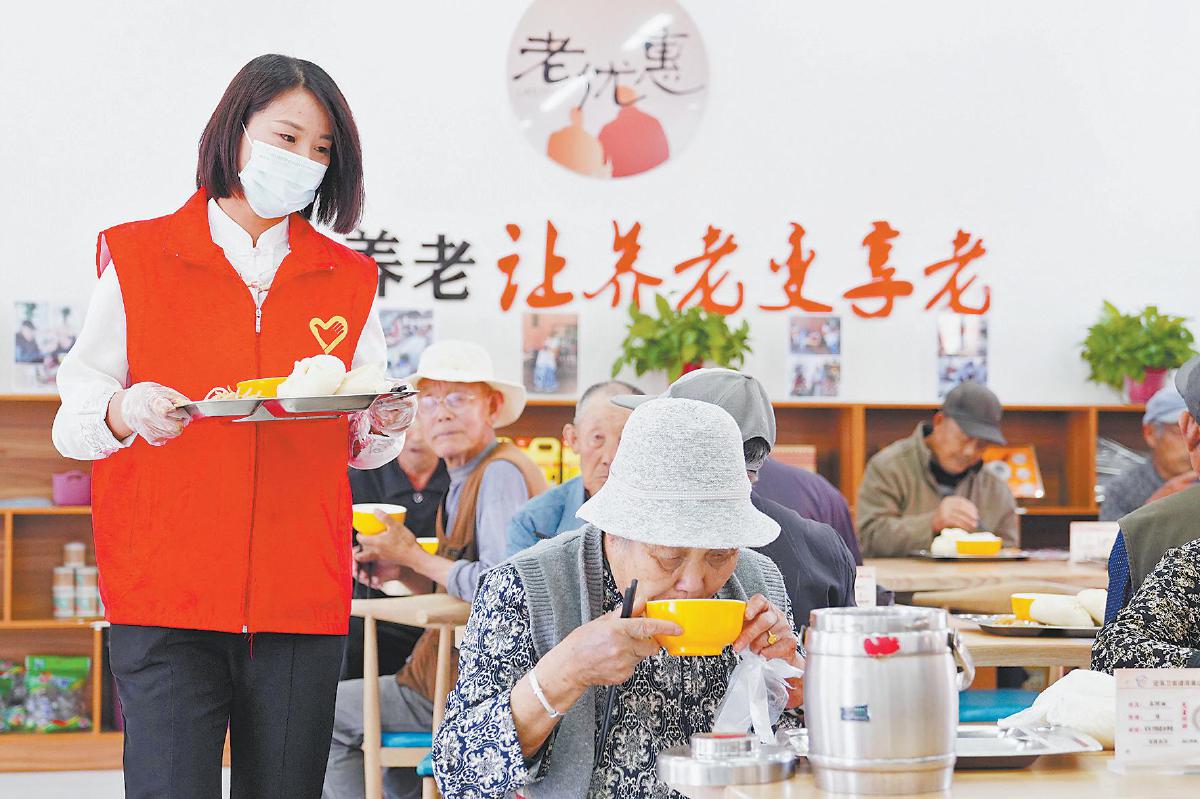 2024年5月10日,在山东省日照市岚山区安东卫街道凤凰山社区养老服务中心,志愿者在为老人端饭。日照市岚山区近年来积极探索新型养老模式,通过“区财政+村级集体+社会各界+老人子女”的共建机制,建设村(社区)级养老综合服务中心。