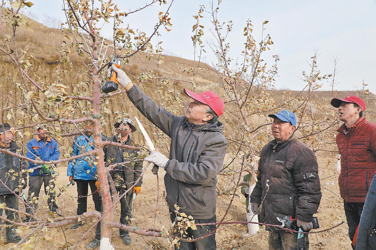 近日,在绥德县赵家坬山地苹果示范园,果农们正在开展果树修剪工作,为秋季果品丰收打下坚实基础。