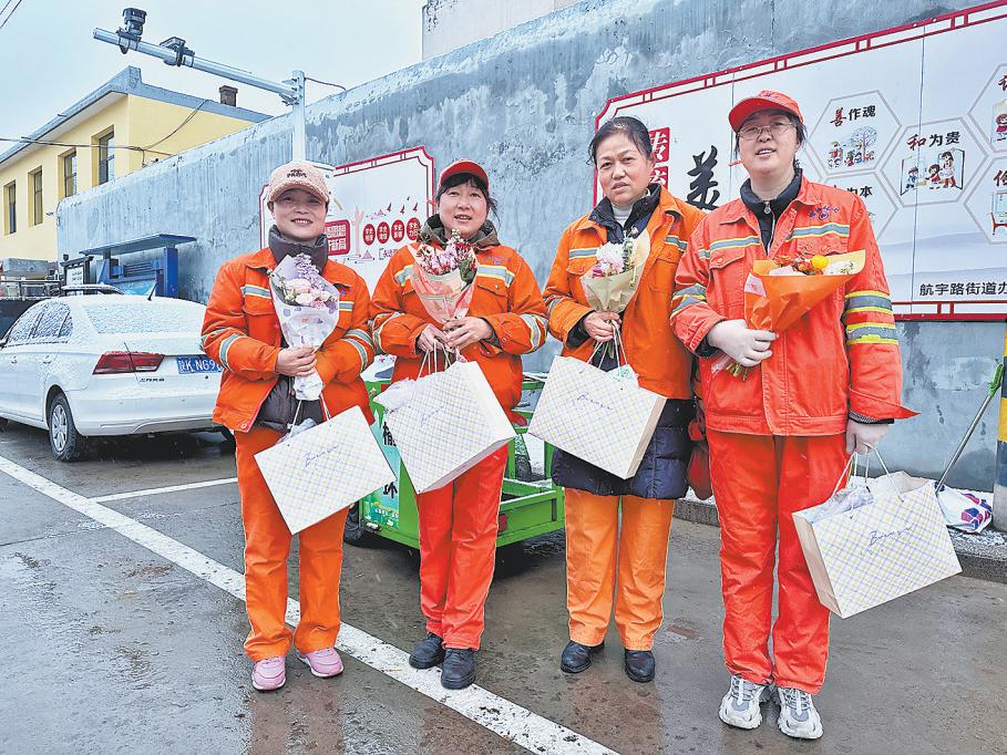 本报讯(通讯员 高瑜) 在3月5日学雷锋日和3月8日妇女节即将到来之际,榆阳区航宇路街道航宇路社区开展了一场特别的慰问活动,为辖区内的环卫工人送上爱心早餐和鲜花,以此致敬“城市美容师”,弘扬雷锋精神,传递节日温暖。