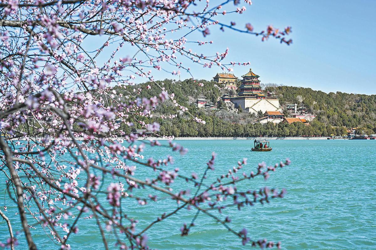3月16日,游客在北京颐和园乘船赏花游玩。