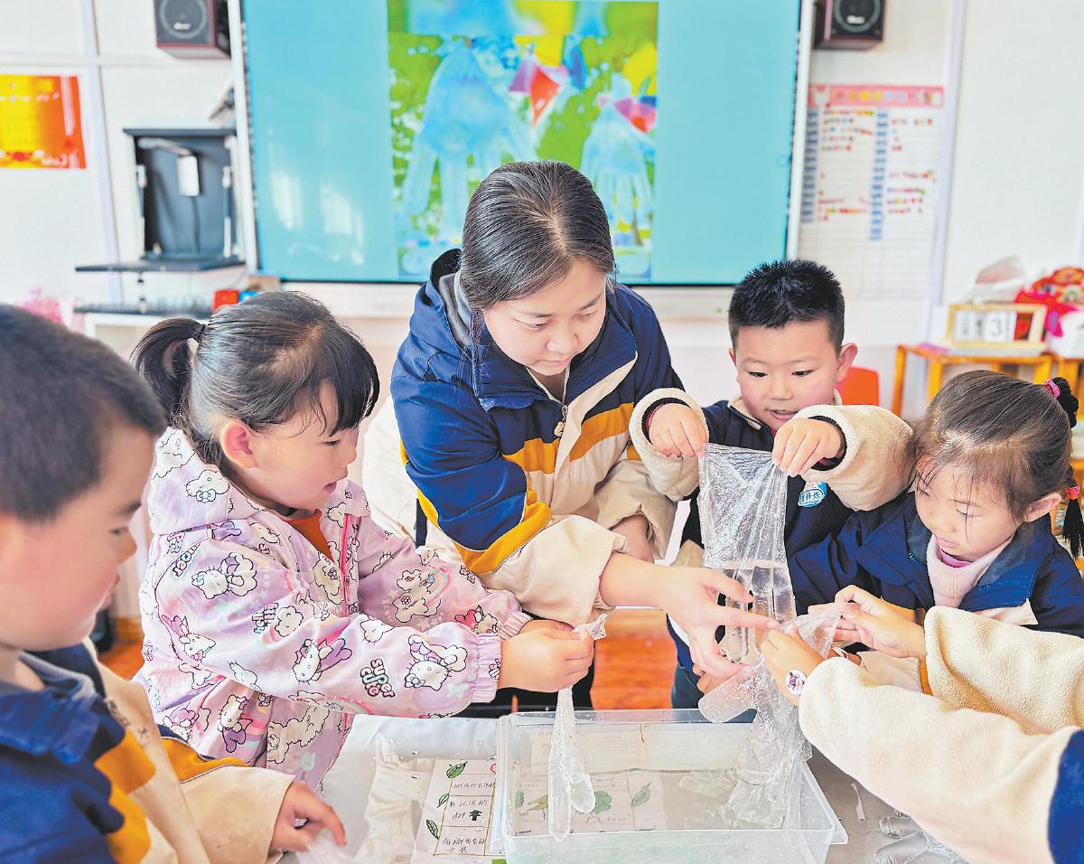 图为老师带领小朋友们做科学小实验,了解水的形状、温度、颜色。 杨聂而 摄
