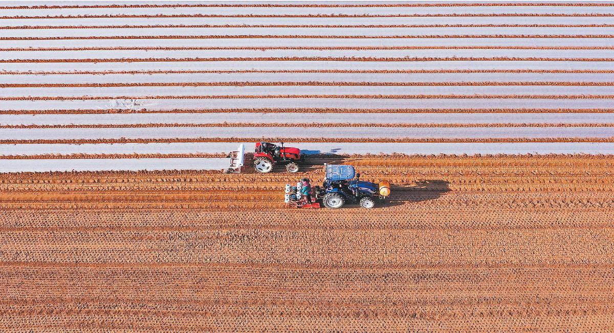 3月22日,在靖边县东坑镇伊当湾村胡萝卜基地,全自动播种机在田垄间隆隆作响。随着机械臂精准起落,点播种子、铺设滴灌带、喷洒除草剂等工序一气呵成,随后覆上农膜。