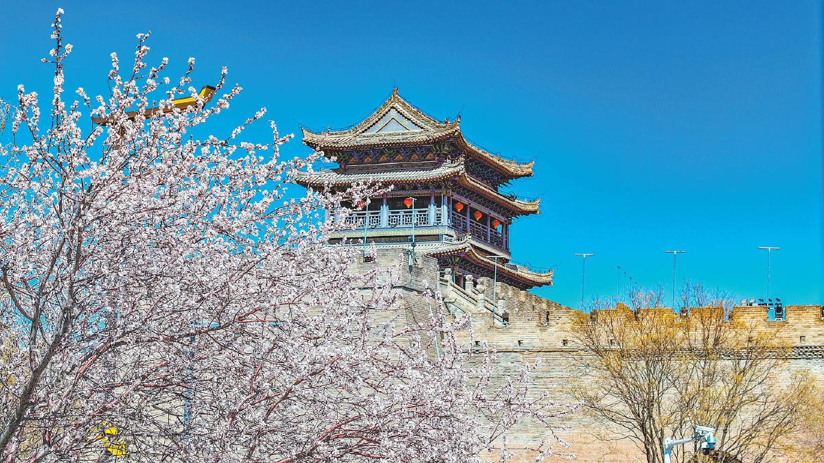 3月29日,榆林古城南门杏花绽放枝头,美丽景色吸引众多市民游客驻足观赏、拍照打卡,乐享春日时光。 记者 常旭峰 摄
