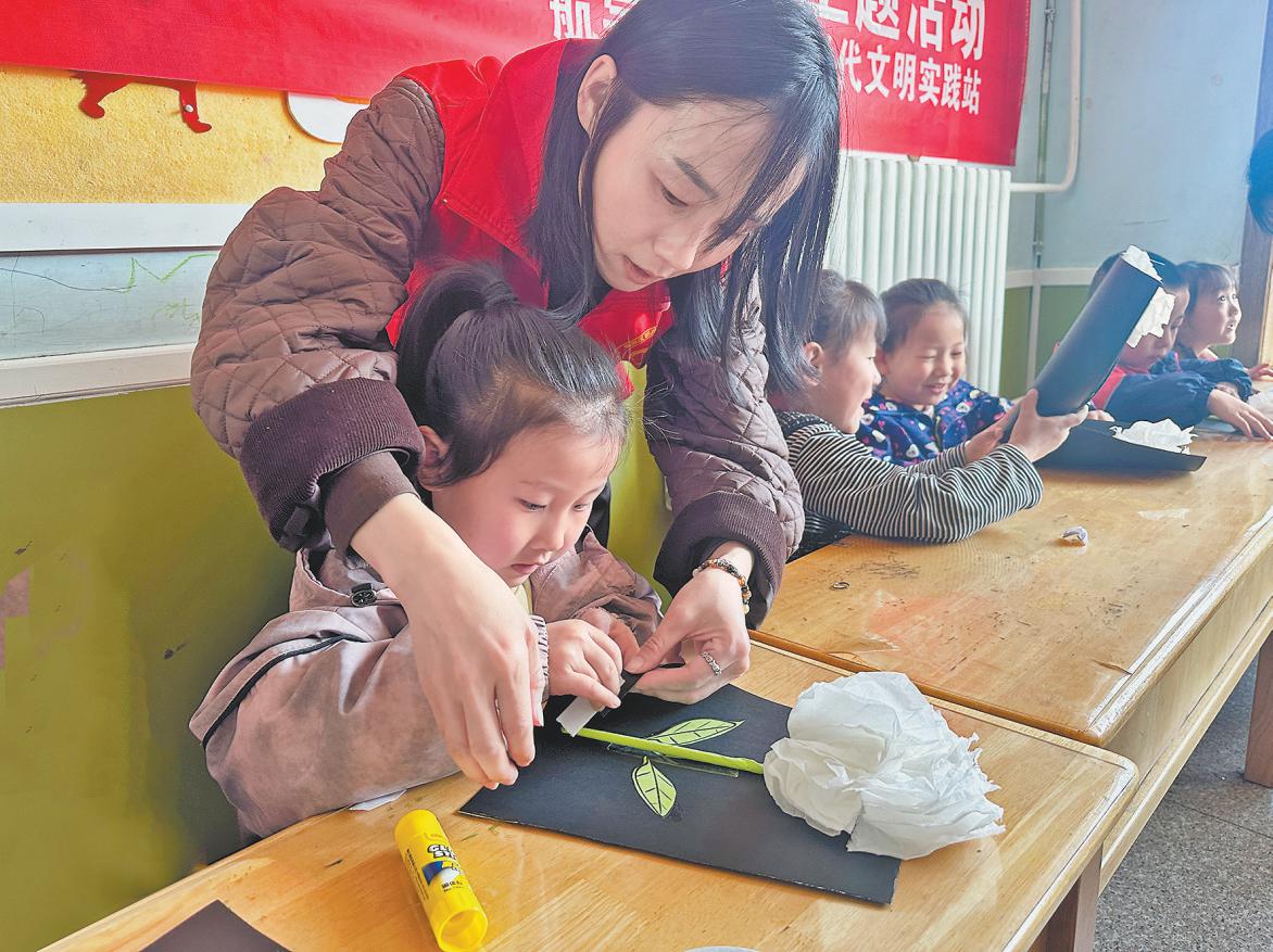 孩子们在老师的指导下制作纸花。高瑜 摄