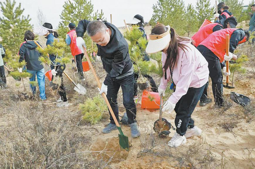 东风拂绿万象新,铁锹轻扬沃土勤。活动现场,大家分工协作,挥锹铲土、扶苗填坑、浇水灌溉,认真细致地完成每一道工序,共同种下了近300株樟子松树苗。春风裹挟着泥土的芬芳,嫩绿的樟子松在地里舒展着枝叶,勾勒出一幅和美的生态画卷,在大家的精心呵护下,新栽苗木挺立山岗,稳稳扎根于沙土之中,成为沙地上铺就的绿色铠甲,锁住流动的黄沙,为这片土地增添了一抹盎然的生机与活力。