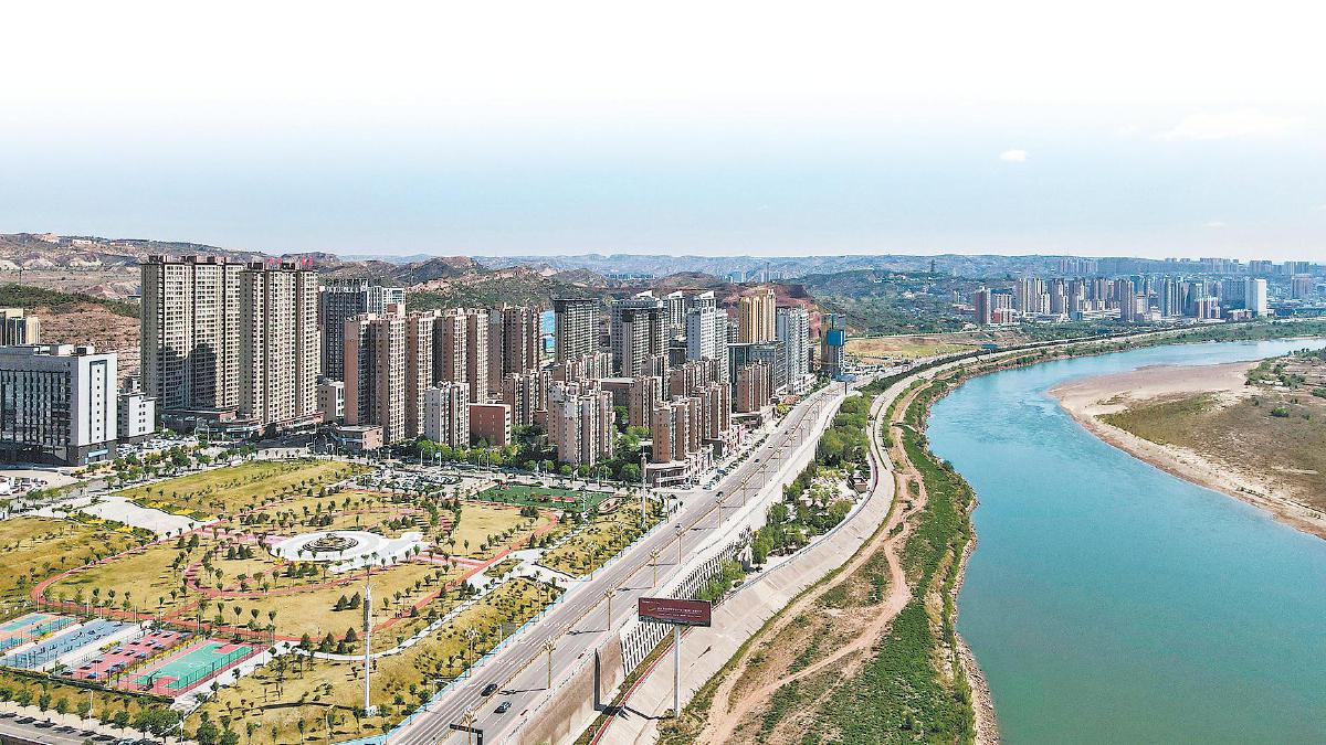 款款流淌的黄河,绿意盎然的公园,鳞次栉比的建筑,车水马龙的道路,共同勾勒出府谷城市发展的新图景(无人机照片)。记者 杨彬 摄
